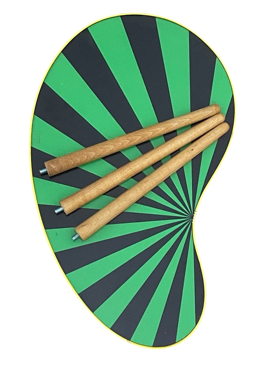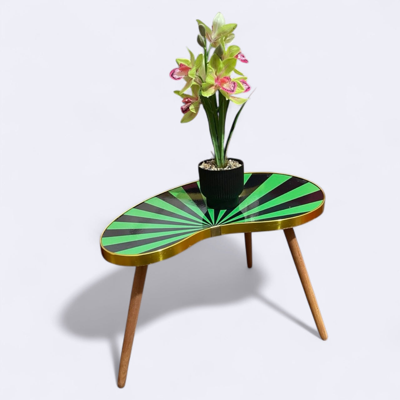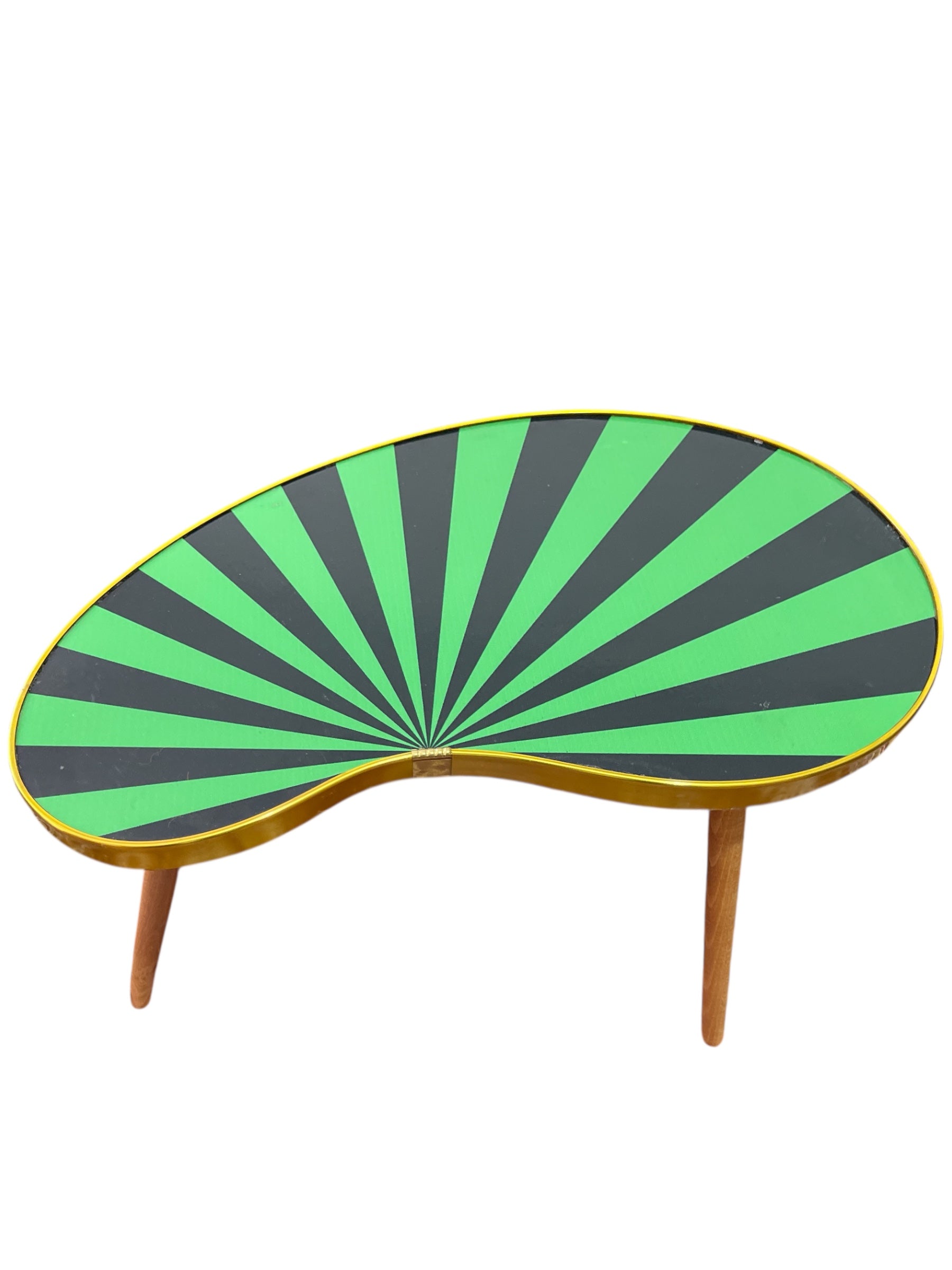 Einzigartige Optik & Hochwertige Anfertigung: Dieser Tisch besticht durch seine außergewöhnliche Farbkombination aus tiefem Grün und elegantem Schwarz im Sunburst-Design – eine moderne Hommage an die kühnen Farben und Muster der 50er Jahre. Das wunderschöne Blatt aus grüner und schwarzer Formica oder hochglänzendem Material im charakteristischen Sunburst-Muster wird von einem eleganten goldfarbenen Abschlussrand perfekt eingerahmt. Dieser Tisch ist eine frische Anfertigung und besticht durch makellose Verarbeitung.