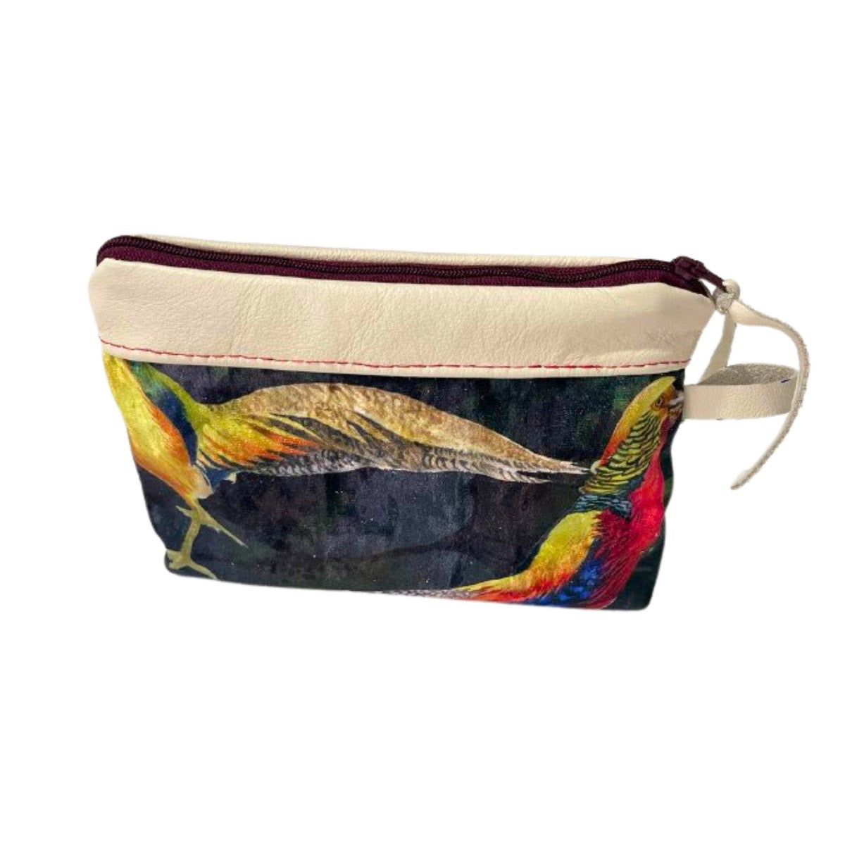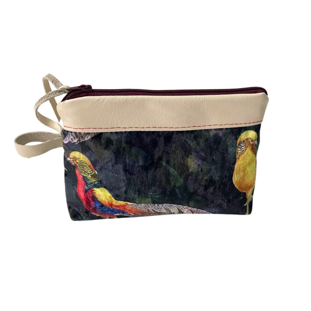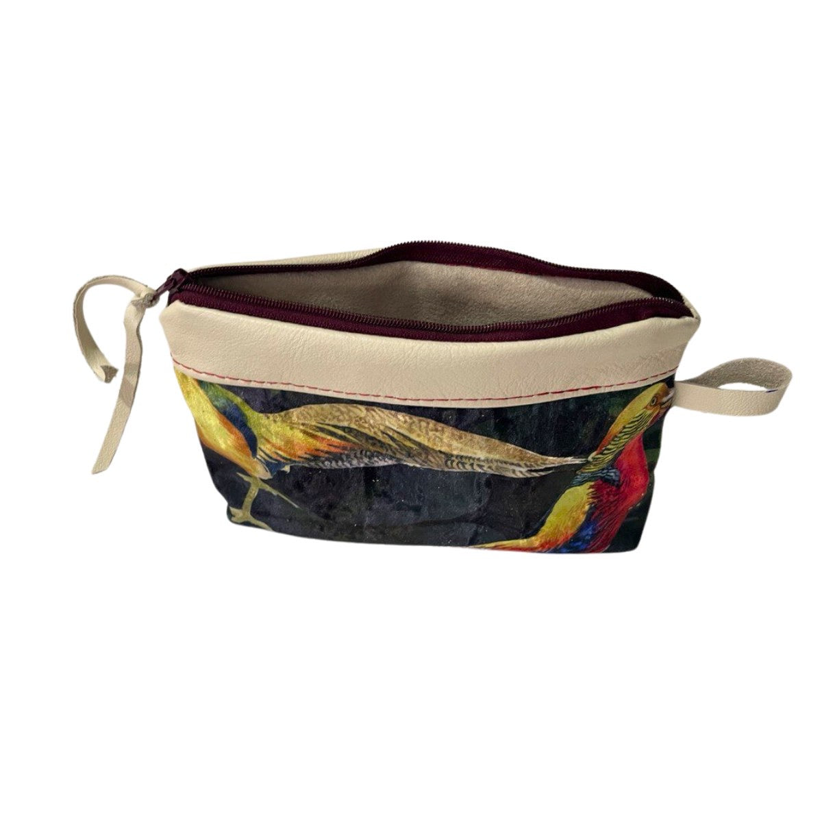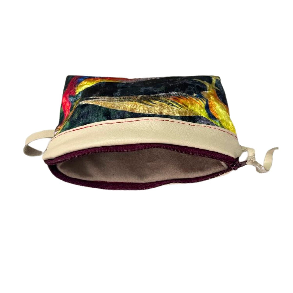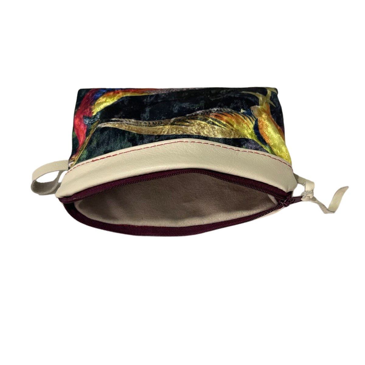 Diese wunderschöne Multifunktionstasche wurde aus hochwertigem Teilleder und Digital-Samtstoff in Handarbeit gefertigt. Die Tasche hat eine Breite von 20,5 cm und eine Länge von 13 cm und bietet viel Platz für deine wichtigsten Dinge. Das Design entspricht einem Tropischem Vogel muster.