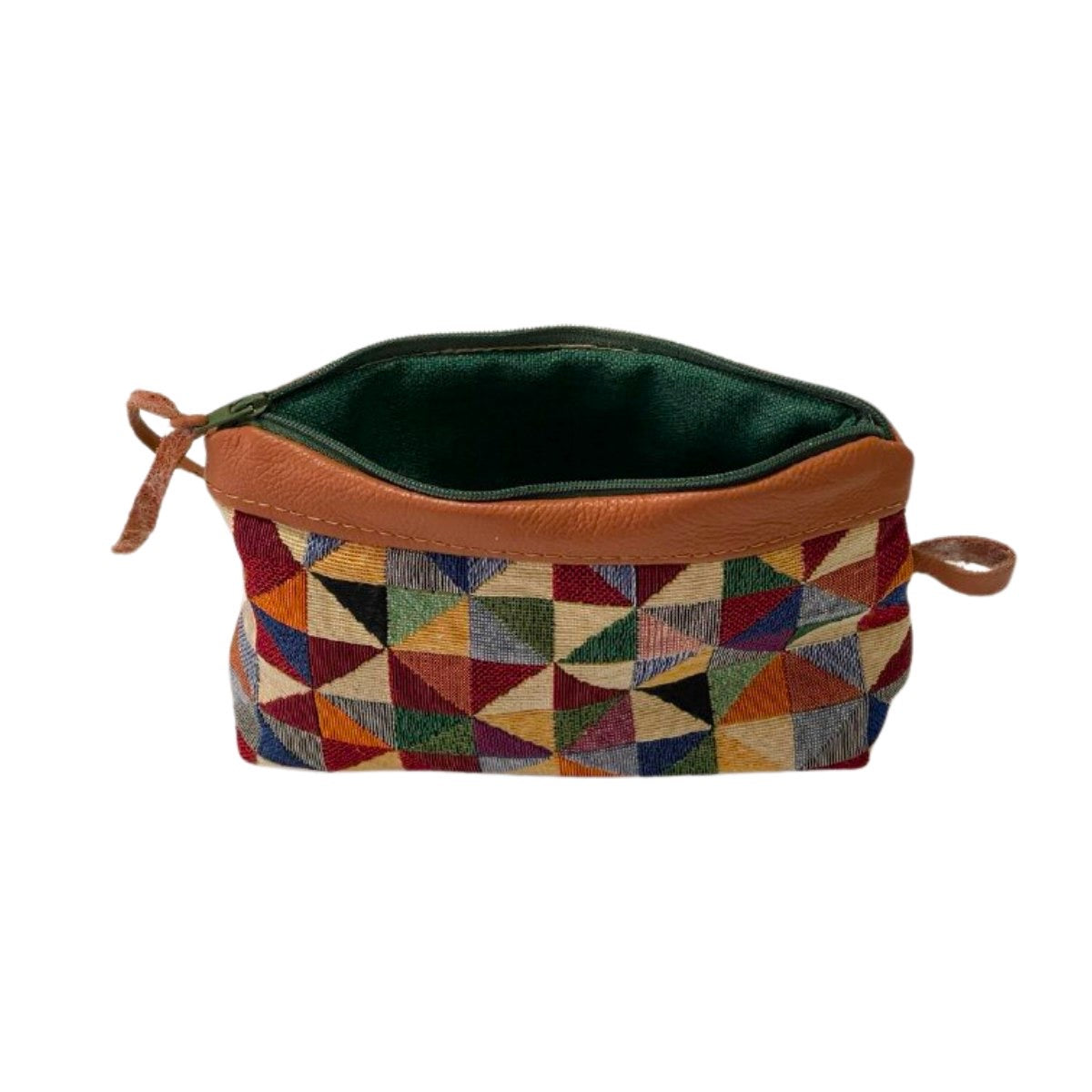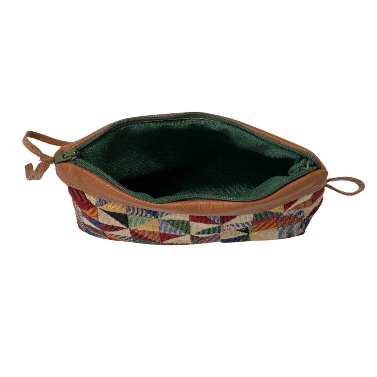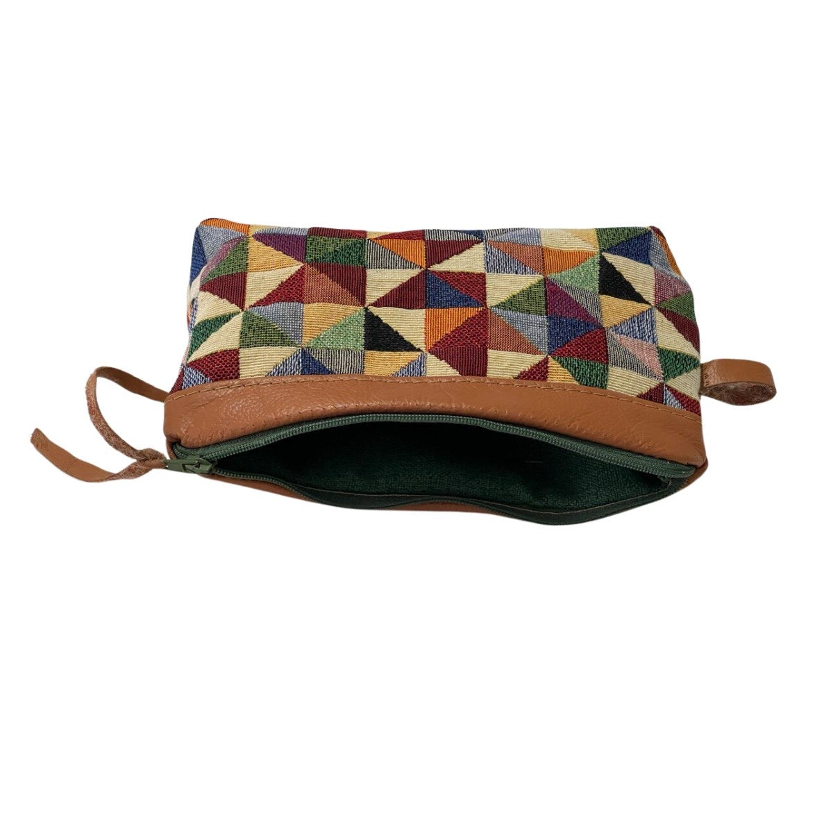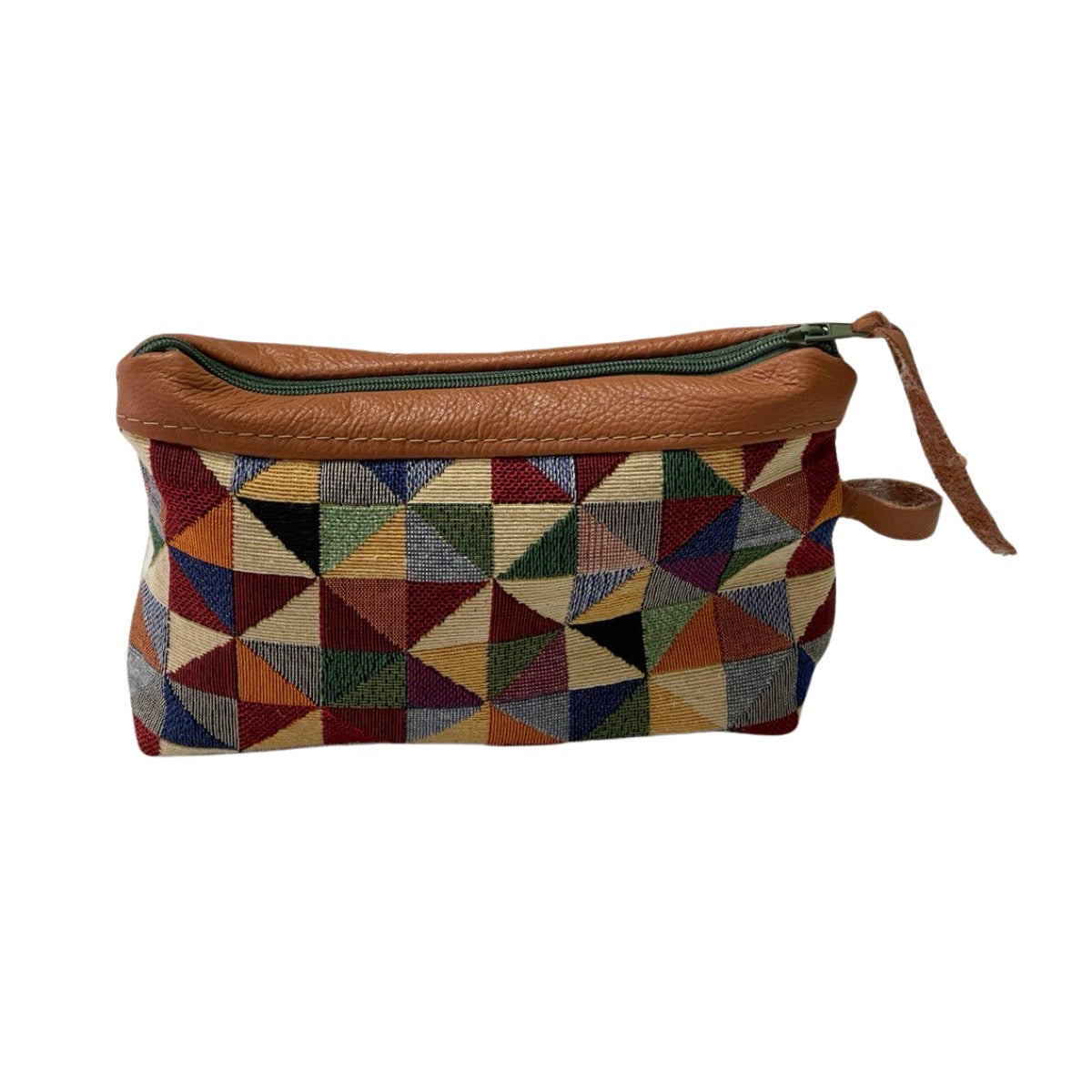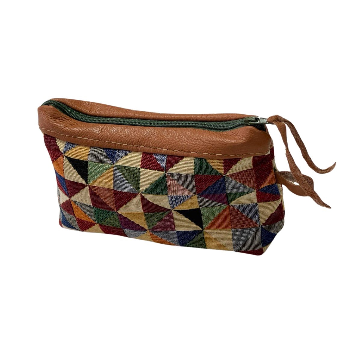 Diese wunderschöne Multifunktionstasche wurde aus hochwertigem Teilleder und Gobelin in Handarbeit gefertigt. Die Tasche hat eine Breite von 20,5 cm und eine Länge von 13 cm und bietet viel Platz für deine wichtigsten Dinge. Das Design entspricht einem Geometriemuster.